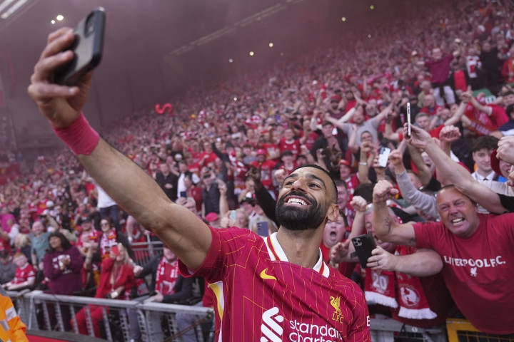 战胜热刺后,利物浦前锋萨拉赫在场边与球迷合影。
